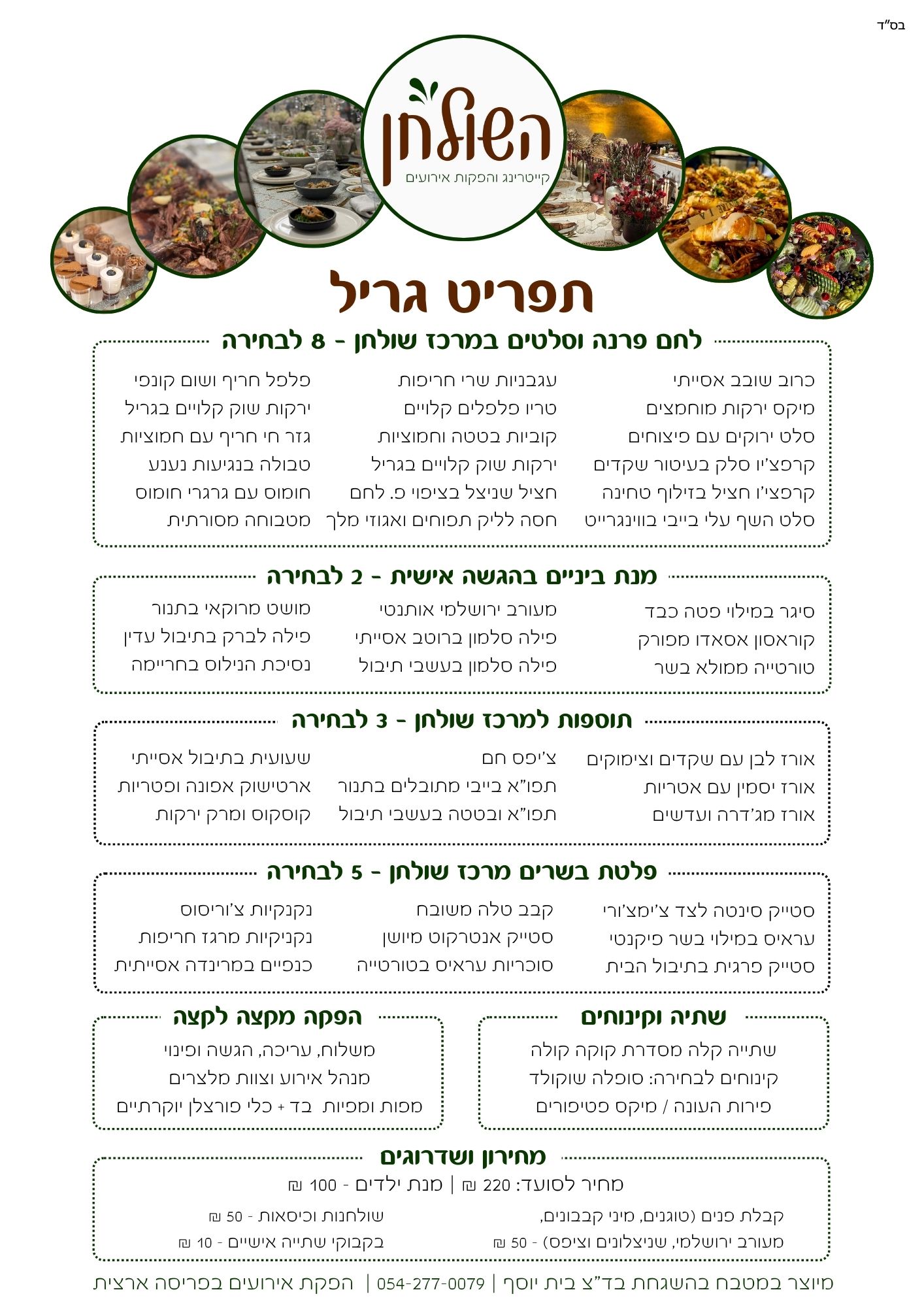 החבילה כוללת את התפריט המלא (סלטים, בשרים, תוספות וקינוחים), שתייה קלה מסדרת קוקה קולה, צוות שירות מלא, מפות פרימיום וכלי פורצלן.