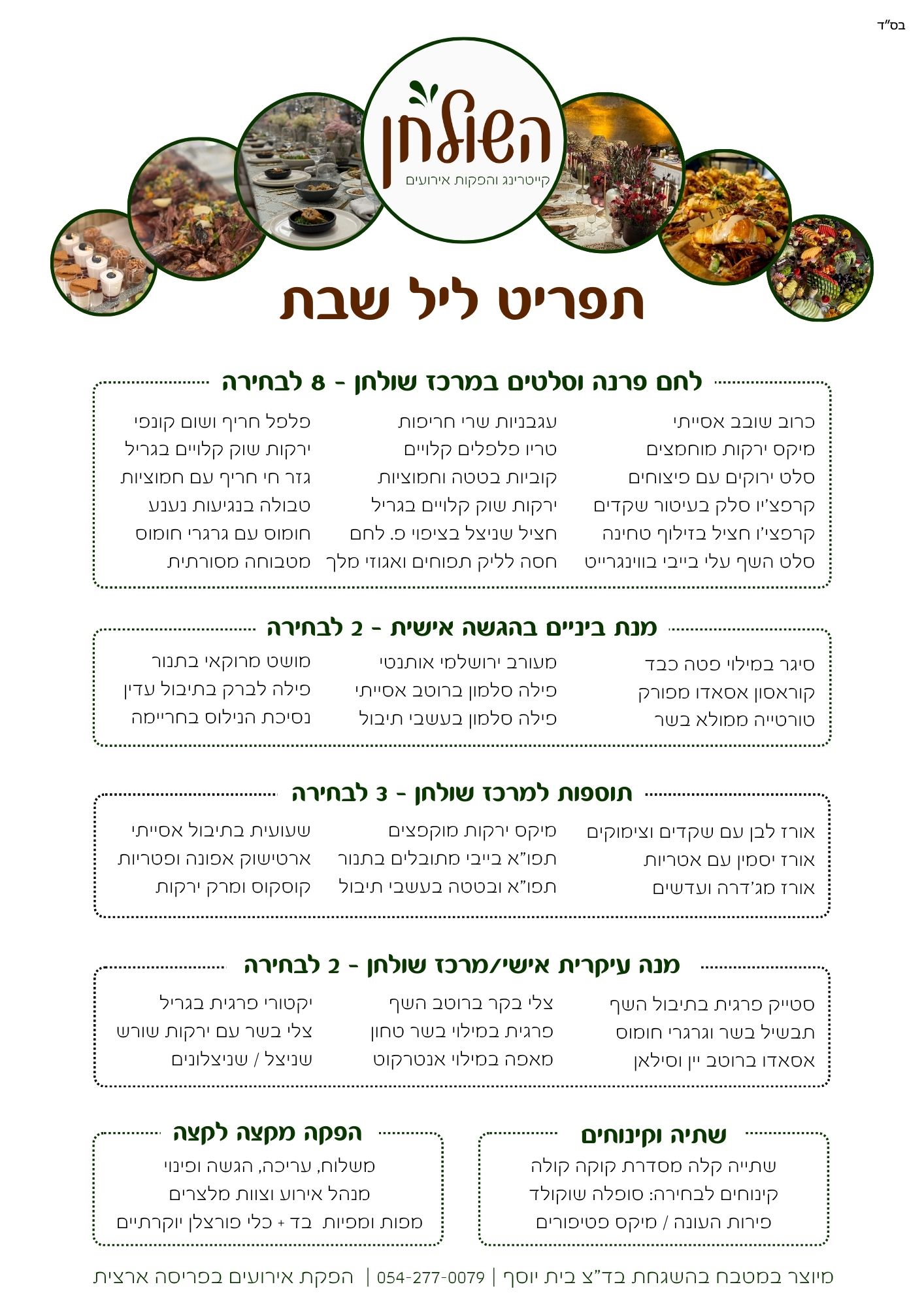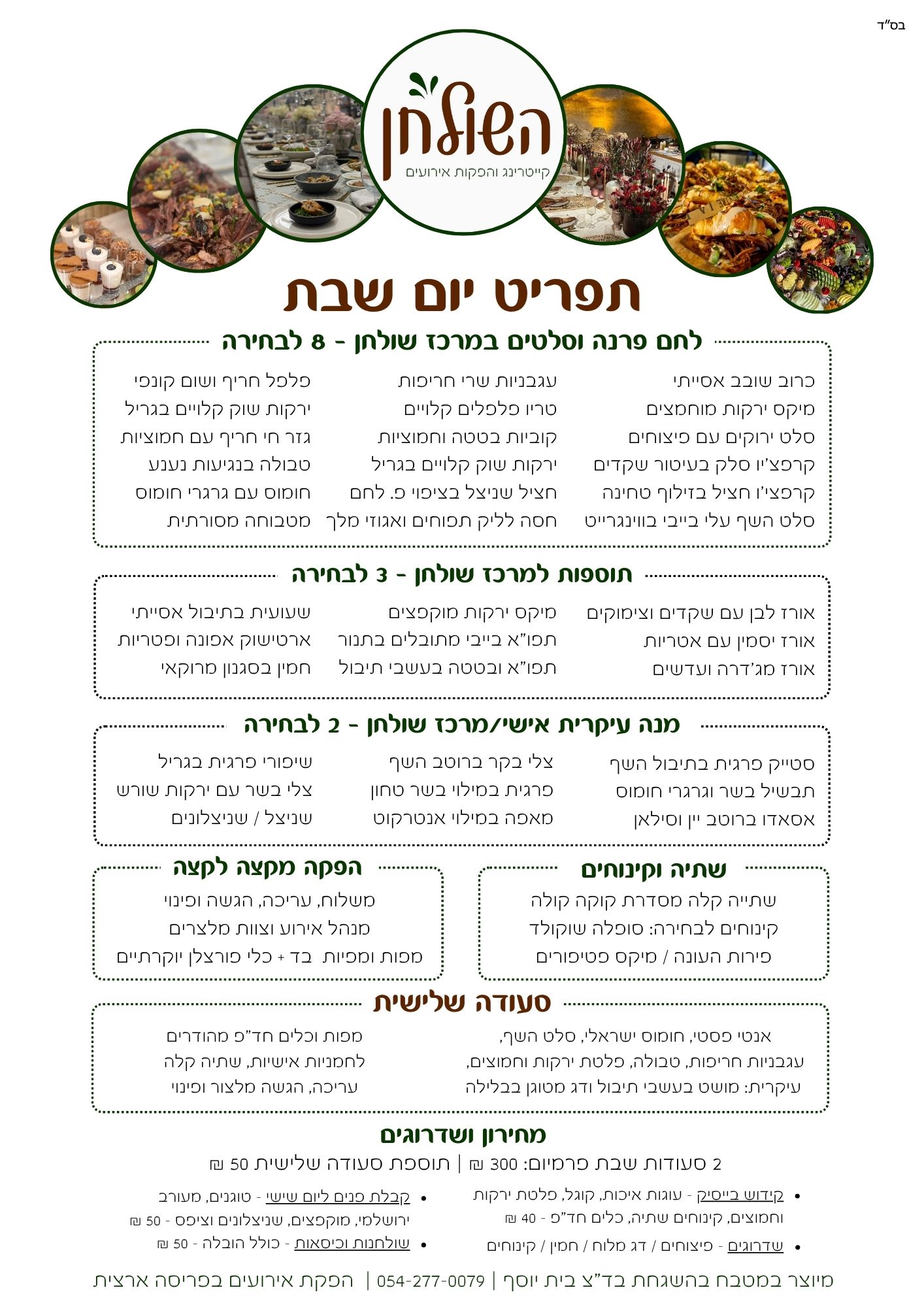 - תפריט שבת עשיר: מבחר סלטים במילוי שוטף, מנות דגים וביניים, מנות עיקריות בשרים, תוספות חמות וקינוחים מרהיבים.